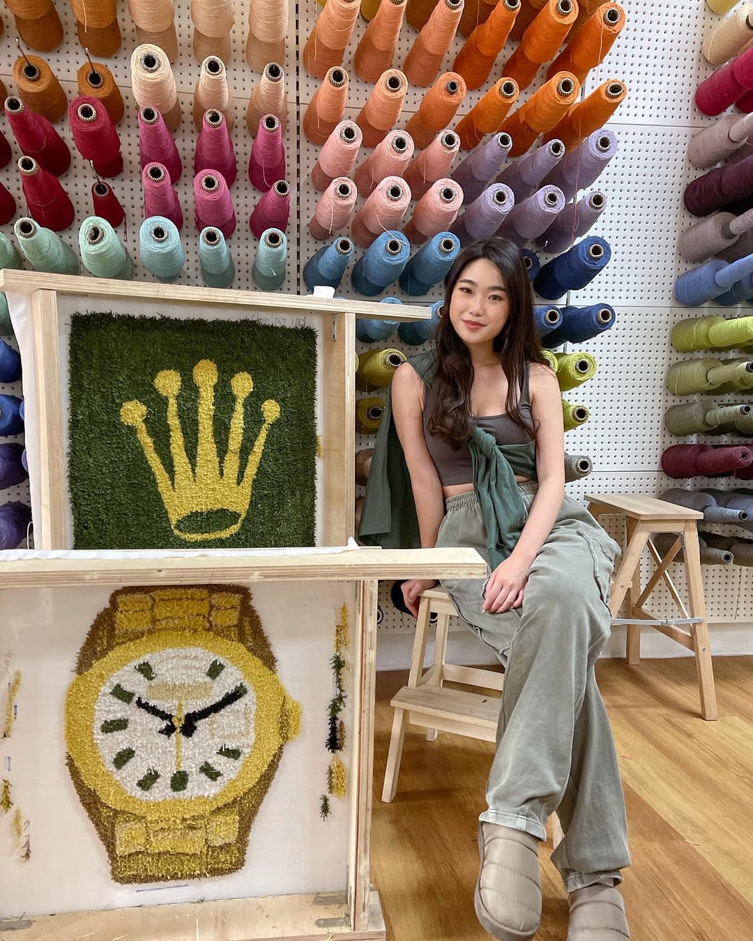 We provide a tufting gun, monk's cloth, 140+ yarns in different colors and materials (25 colours of cotton yarn, 50 colours of milk cotton yarn, 70 colours of wool yarn), rug tufting frames, fabric glue, and backing finishes. Projectors are available to help in sketching your design.